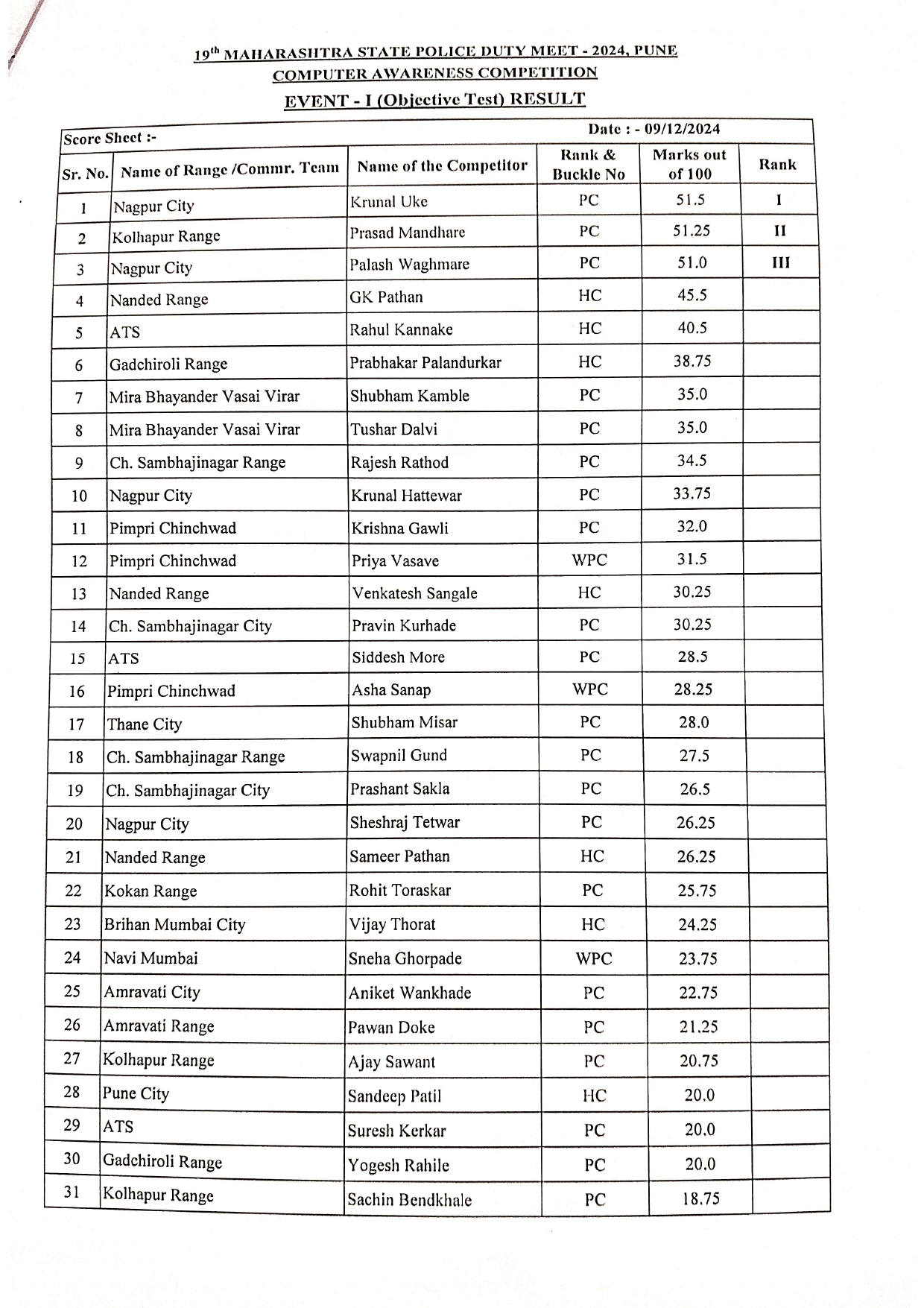 Computer Awareness Competition EVENT -1 (Objective Test) Result